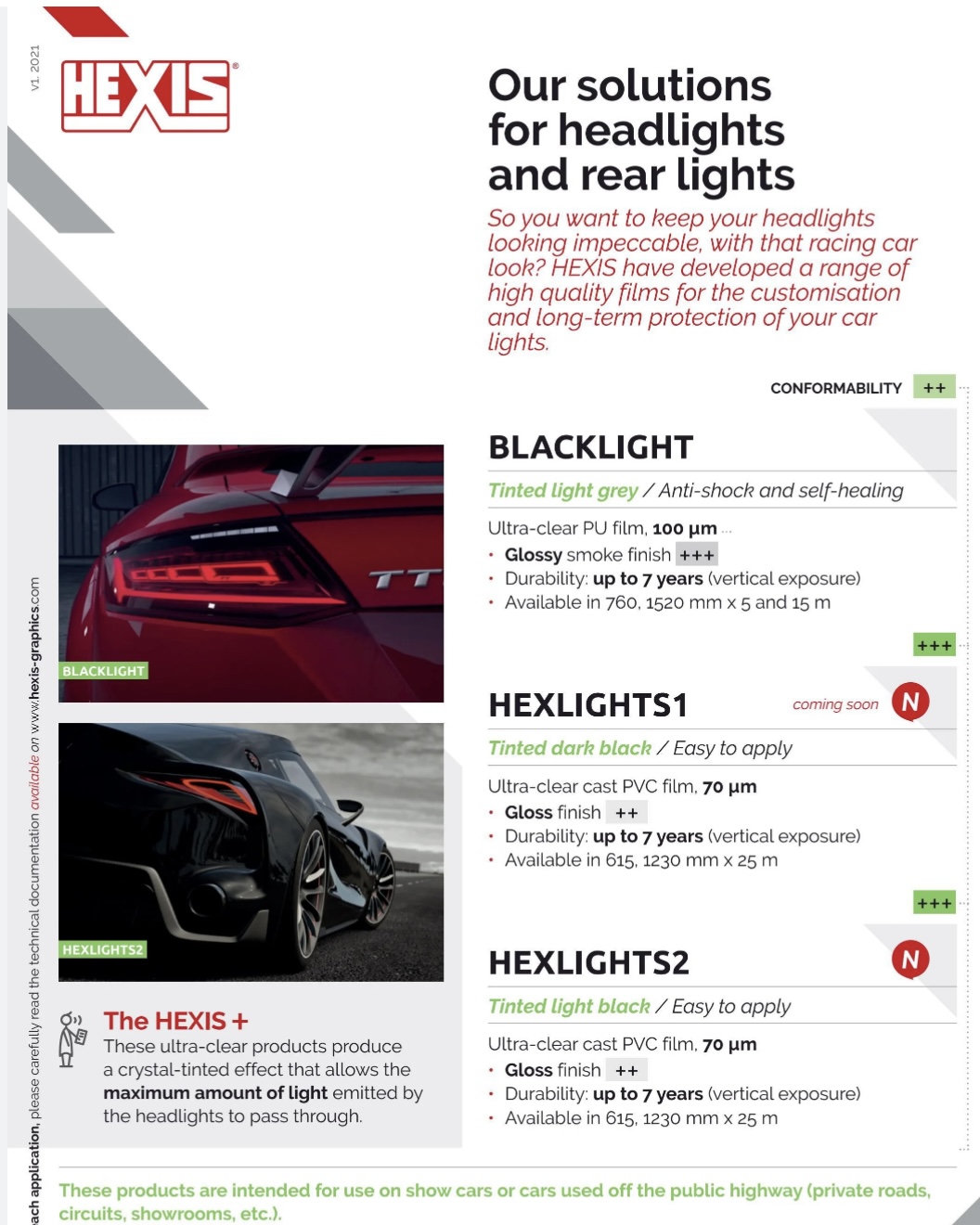 Hexis BLACKLIGHT is a poly urethane adhesive film specially developed for protecting transparent vehicle surfaces. Due to its excellent shock-absorbing properties, this film protects glazings, head and back lights … against chips caused by stones, insects, washing brushes, etc. Glossy, light grey, transparent surface finish. Full rolls are 50ft. long, less than full roll purchases are subjection to a 20% surcharge which is reflected in the per foot pricing.